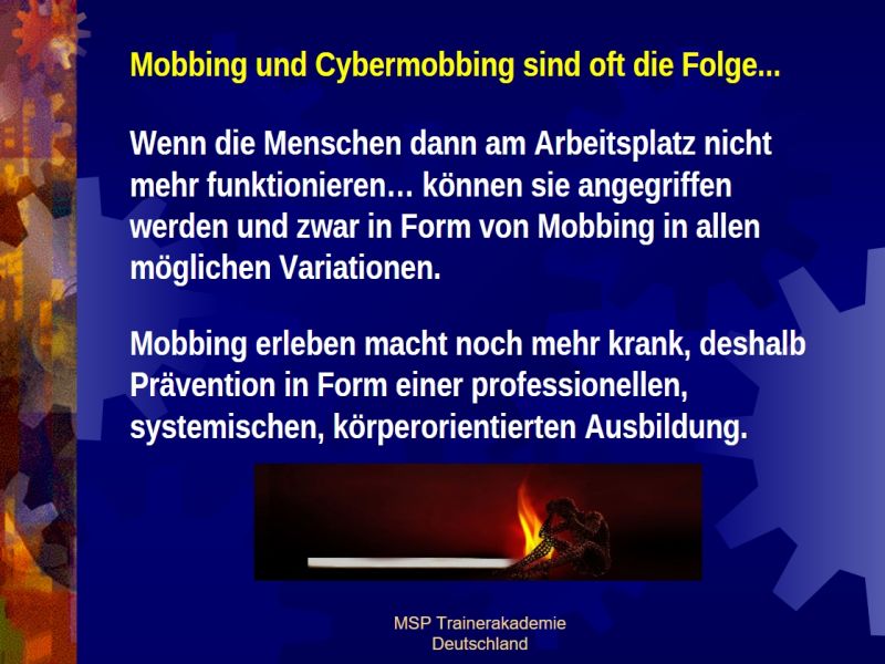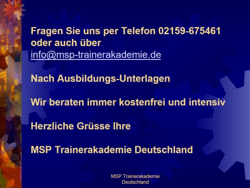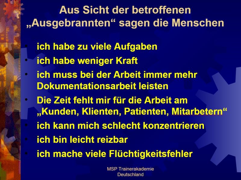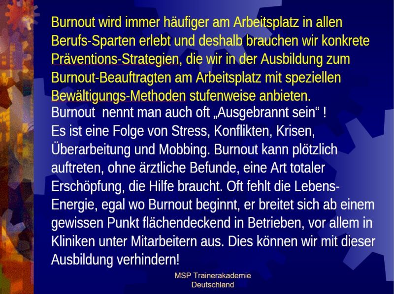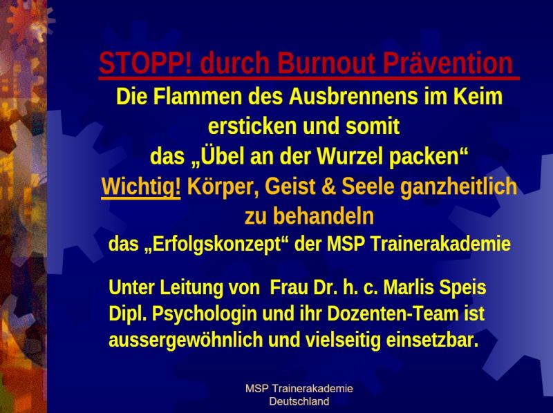 MSP Trainerakademie Deutschland staatlich anerkanntes Institut für Stress-Burnout-Forschung und ganzheitliche Weiterbildung (§ 10 AWBG). Träger nach dem Recht der Arbeitsförderung BRD mit Akkreditierungs-Zulassungsverordnung AZAV MSP Burnoutpsychologische Praxis zur ganzheitlichen, lösungsorientierten, körperorientierten Beratung und Behandlung von Burnout-Patienten