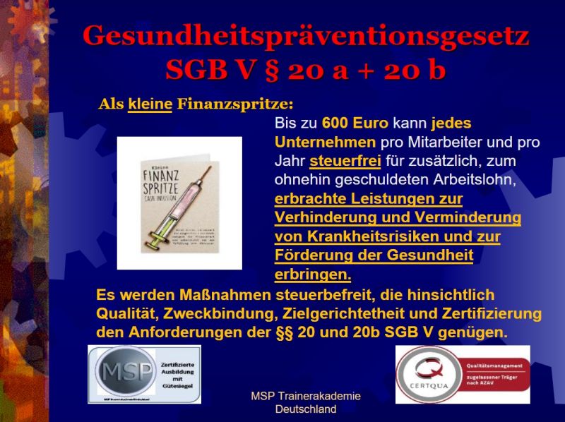 - Nach dem Gesundheitspräventionsgesetz SGB V § 20a+20b zertifizierte